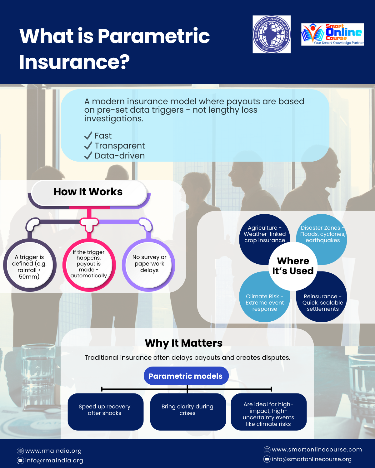 If you want to understand how parametric insurance products are structured, priced, and deployed in real-world scenarios, the Parametric Insurance course by Smart Online Course, in partnership with RMAI, provides structured, industry-relevant learning designed for working professionals. The course focuses on practical frameworks, use cases, and decision-making insights that are increasingly essential across the insurance value chain.
