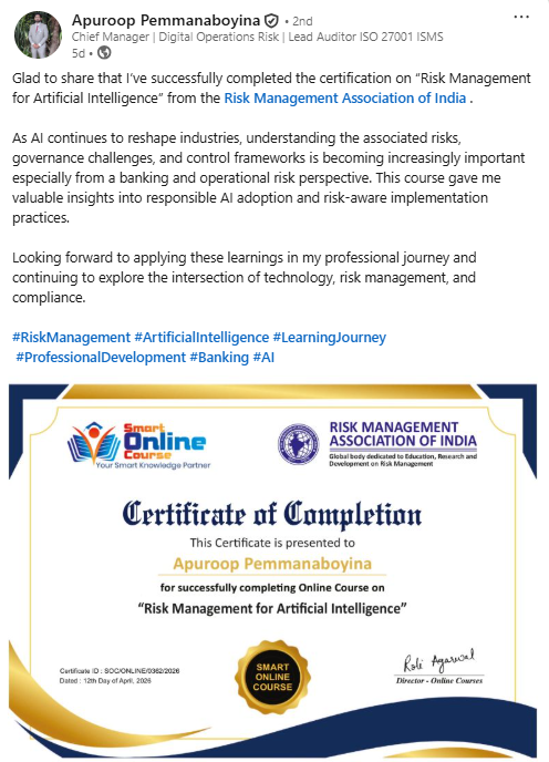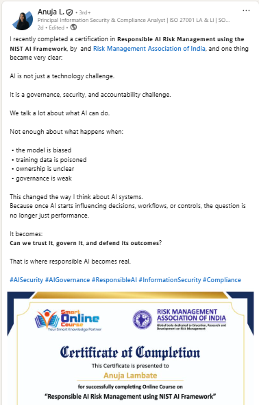 As AI systems rapidly scale across sectors, organisations face rising risks-from algorithmic bias and deepfake fraud to regulatory non-compliance and intellectual property theft. This 8-hour online certificate course equips professionals to navigate the risks of artificial intelligence and machine learning using global frameworks like NIST AI RMF, EU AI Act, and ISO 42001.